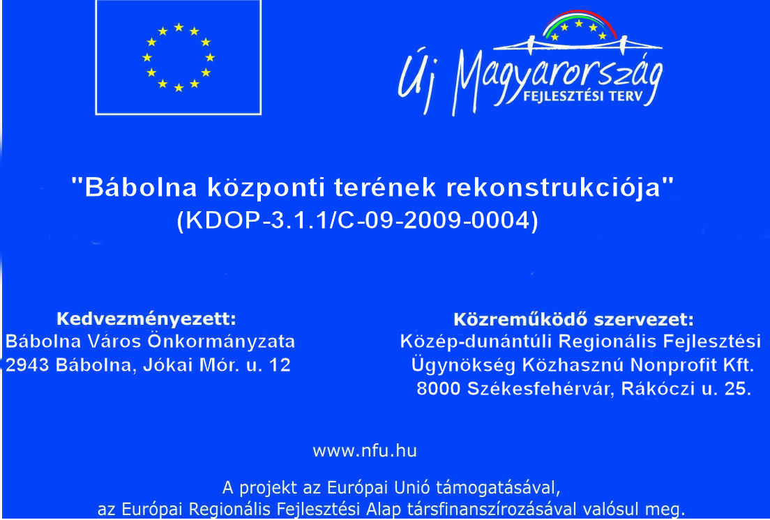 Bábolna központi terének rekonstrukciója2011. június 16. | csütörtökKDOP-3.1.1/C-09-2009-0004 Európai Uniós pályázathoz eddig feltöltött anyagok.Bábolna központi terének rekonstrukciójaDokumentumok:Meghívó záróünnepségreKöszönetnyilvánítás a projektben közreműködőknekPályázati összefoglalóKépgaléria: